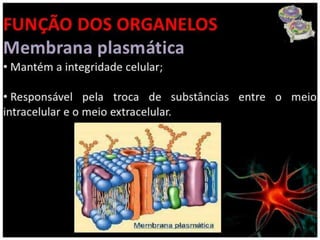 A membrana plasmática possui estrutura de mosaico fluido e função de permeabilidade seletiva. Pode apresentar especializações como microvilosidades, invaginações e desmossomos para aumentar a superfície de absorção ou adesão. Experimentos com hemácias em meios isotônicos, hipertônicos e hipotônicos ilustram os processos de osmose, plasmólise e turgescência. O transporte de substâncias ocorre por difusão simples, facilitada ou ativo, enquanto o transporte em