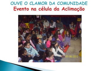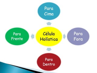 O documento discute o conceito de holismo, que vê o indivíduo como um todo integrado em todas as suas dimensões. A evangelização holística busca atender tanto as necessidades espirituais quanto materiais das pessoas, por meio do evangelho e da responsabilidade social. Células holísticas devem conduzir as pessoas a Deus, promover comunidade e serviço, e alcançar os perdidos.