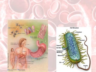 O documento descreve as estruturas e funções básicas da célula, incluindo a membrana plasmática, o citoplasma, organelas como o retículo endoplasmático, complexo de Golgi, lisossomos, mitocôndrias e núcleo. Explica como a célula controla o que entra e sai através da membrana e como as organelas desempenham funções vitais como digestão, respiração e síntese de proteínas.