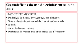 O documento discute os malefícios do uso de celulares por estudantes em sala de aula, incluindo a diminuição da atenção, aumento das notas baixas, e dificuldade em realizar leituras críticas. Também aborda os problemas psicológicos como a dificuldade em desenvolver autonomia e o vício em tecnologia, além das principais dificuldades para professores como fiscalizar conteúdos e manter a atenção de todos. Uma pesquisa mostrou que a proibição de celulares melhorou as notas