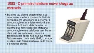 O documento descreve a evolução dos celulares desde 1983 até 2019, quando os primeiros aparelhos eram grandes e pesados com poucas funções, até os smartphones modernos leves e com câmeras, internet, aplicativos e assistentes virtuais.