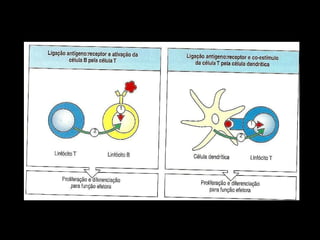 1) O documento descreve as principais células do sistema imune, incluindo células dendríticas, fagócitos mononucleares, linfócitos T e B, células NK e granulócitos.