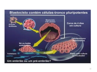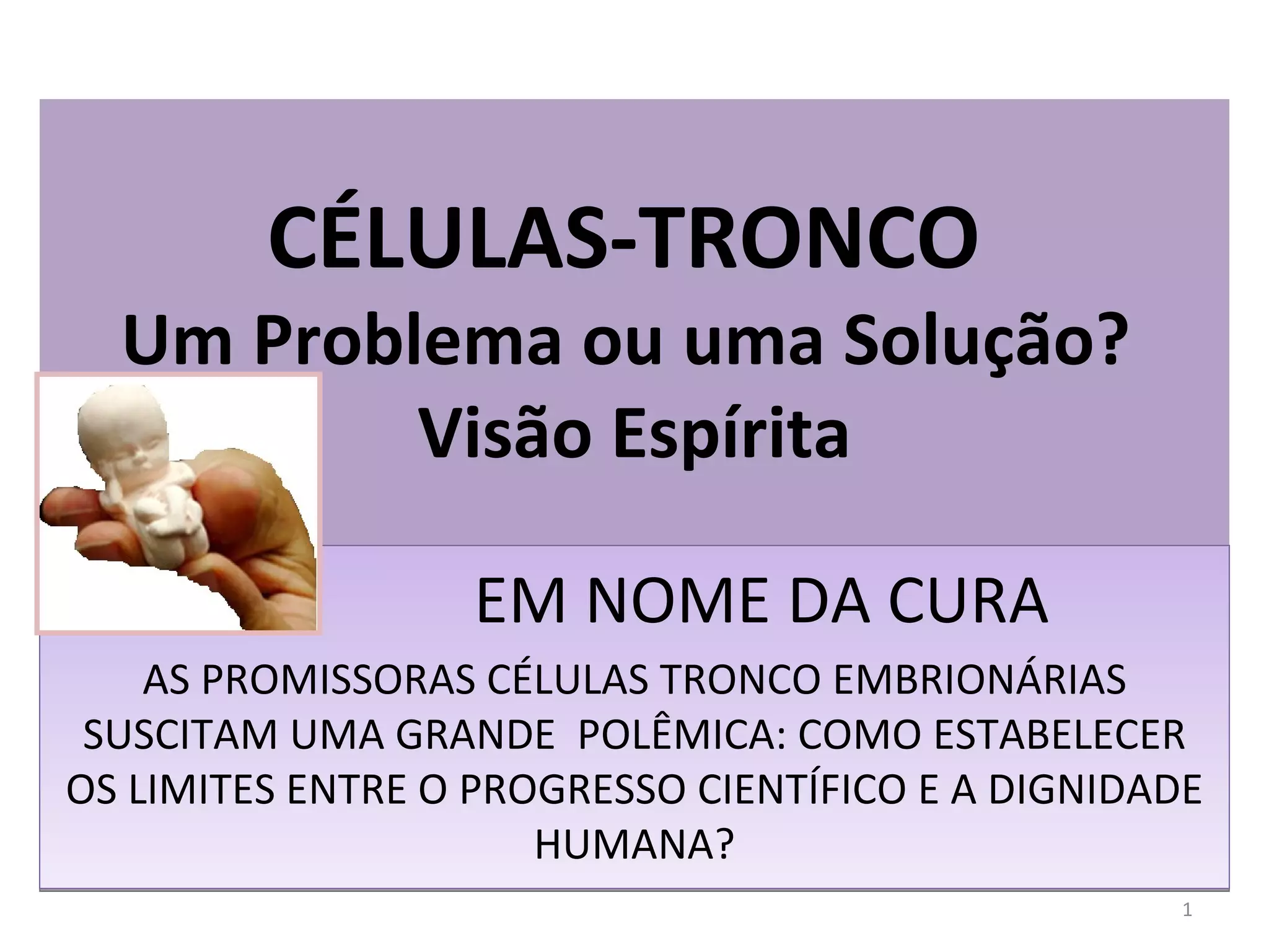 1) O documento discute as células-tronco embrionárias e os desafios éticos relacionados à pesquisa e terapia com essas células.