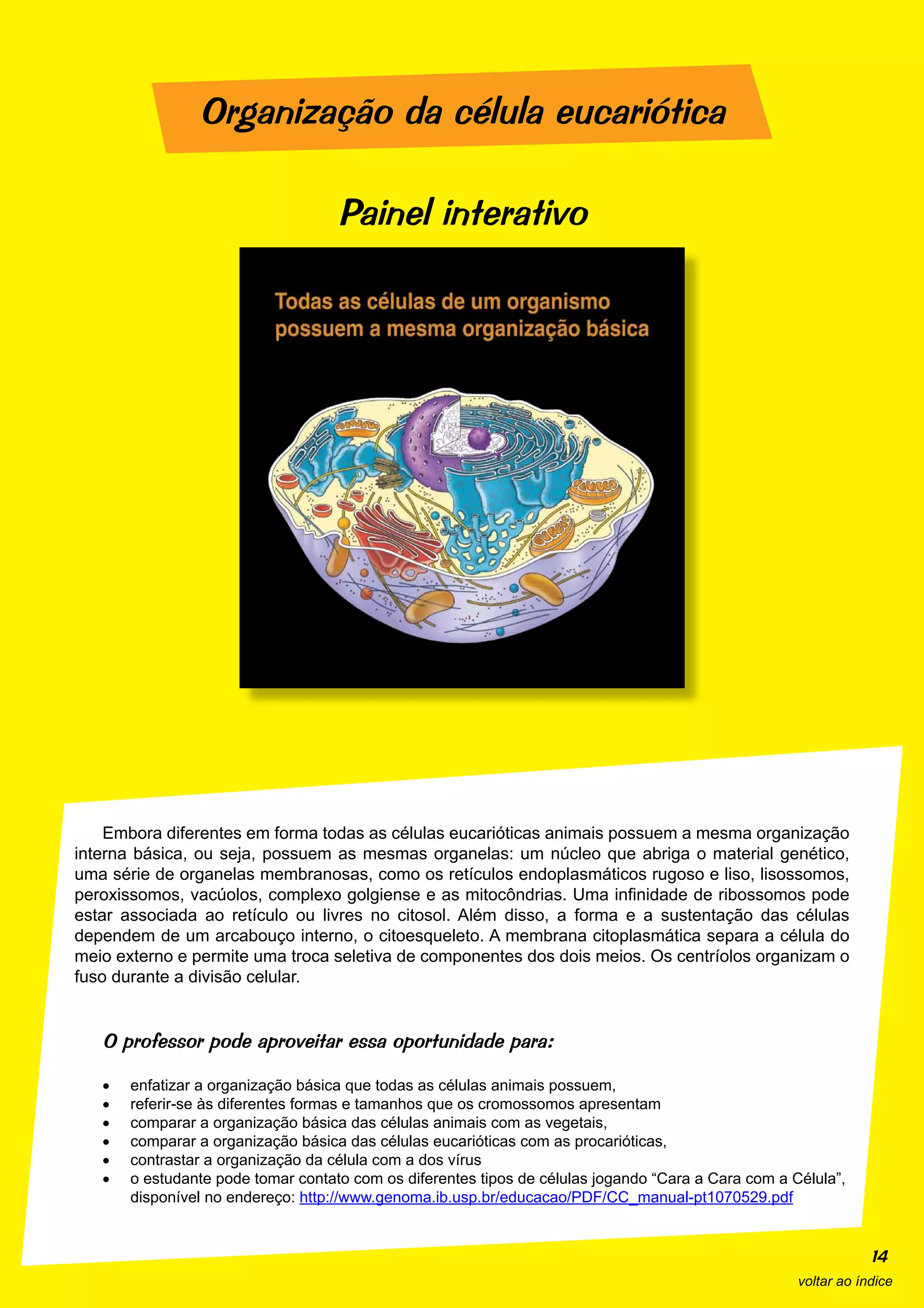 O documento descreve a organização básica das células eucarióticas, incluindo o núcleo, organelas como o retículo endoplasmático e mitocôndrias, e o citoesqueleto. Também menciona que as células animais compartilham esta organização, embora possam variar em forma e tamanho.