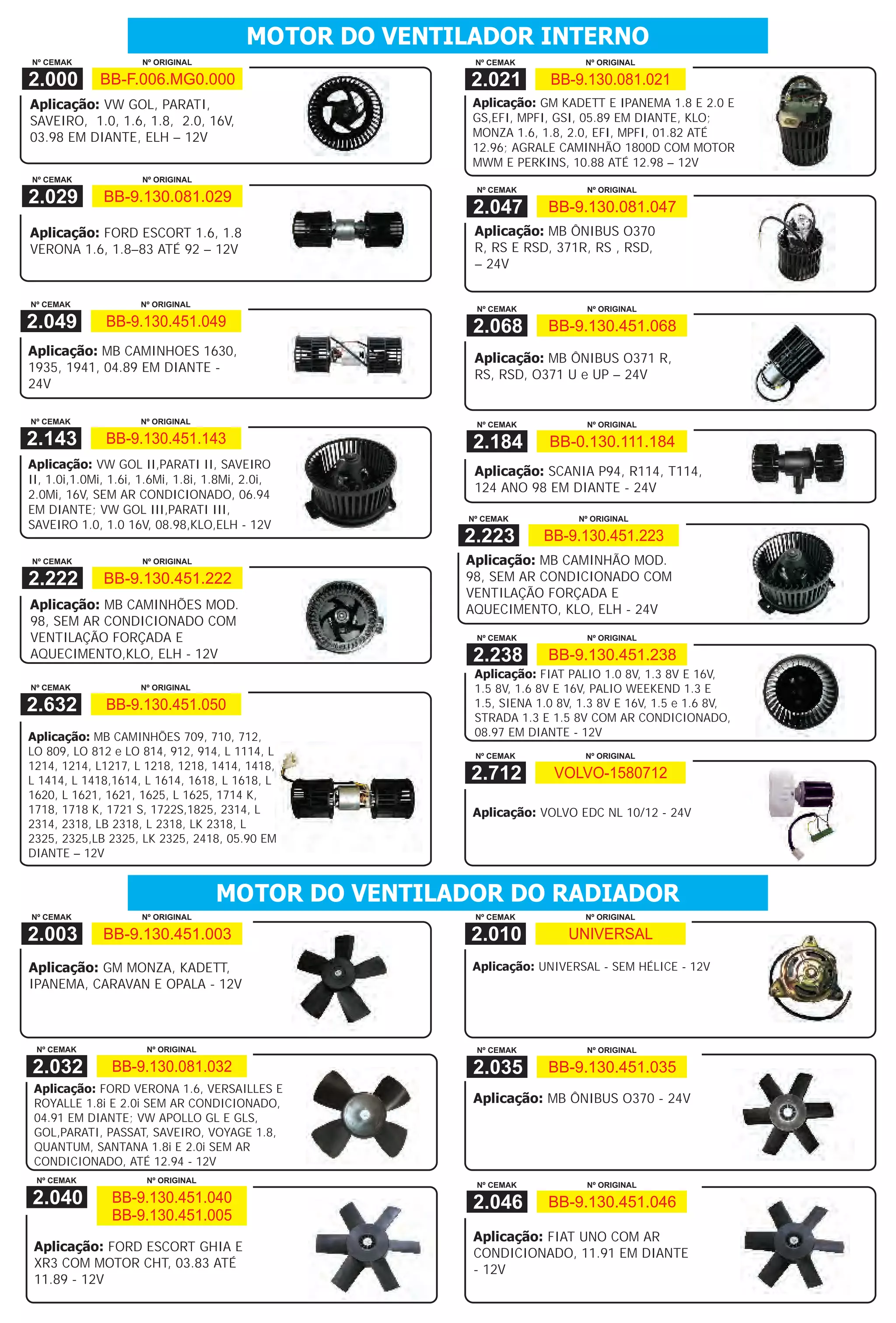 Este documento fornece uma lista de números de peças e suas respectivas aplicações para ventiladores de radiador e ventiladores internos de vários veículos. As informações incluem marca e modelo de veículo, ano, motor e detalhes sobre ar condicionado. Em mais de 50 itens, são especificados números de peças originais e substitutos para vários fabricantes como Volkswagen, GM, Ford, Mercedes Benz, Fiat, Volvo e Scania.