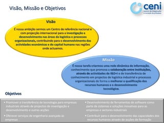 Este documento descreve a visão, missão, objetivos e atividades de um centro de investigação e desenvolvimento. A visão é se tornar um centro de referência nacional e internacional nas áreas de logística e processos organizacionais. A missão é criar uma rede de informação e conhecimento para promover a colaboração entre instituições através de atividades de I&D. Os objetivos incluem a transferência de tecnologia para empresas e o desenvolvimento de capacidades humanas.