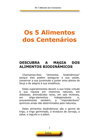 O documento descreve 5 alimentos associados à longevidade: o germe de trigo, o trigo germinado, a levedura de cerveja, a salsa e o iogurte. Estes alimentos são ricos em vitaminas, minerais, proteínas e outros nutrientes vitais para a saúde e bem-estar. O documento explica os benefícios de cada alimento e como incorporá-los na dieta.
