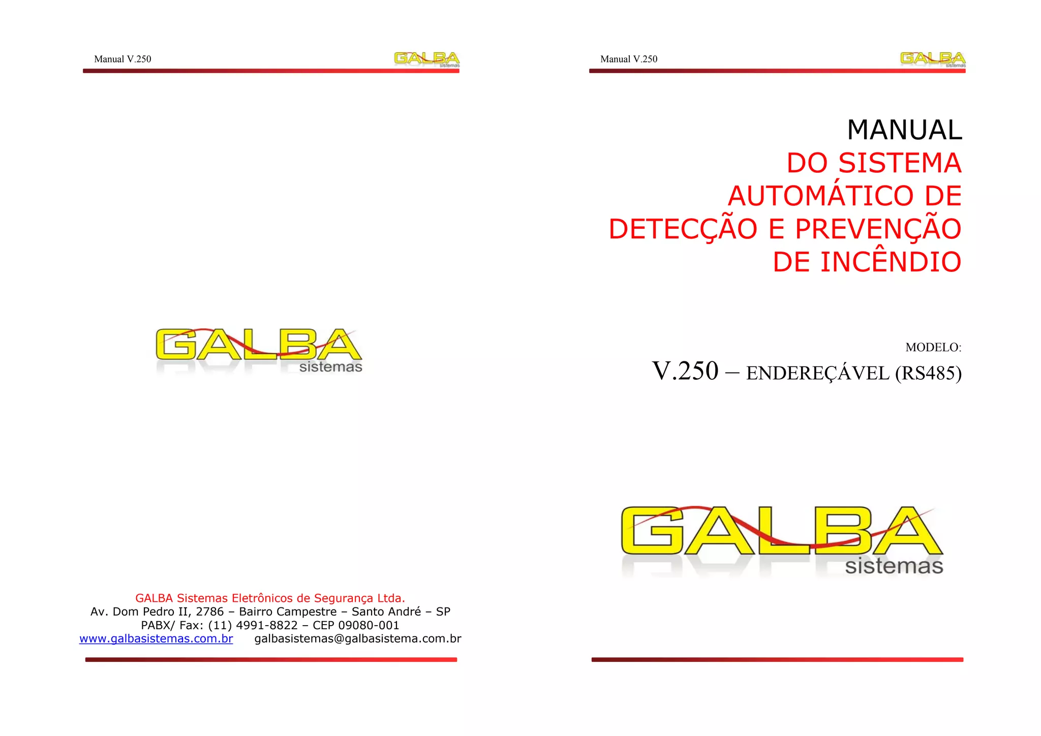 1. O documento apresenta o manual do sistema automático de detecção e prevenção de incêndio modelo V.250 endereçável (RS485).