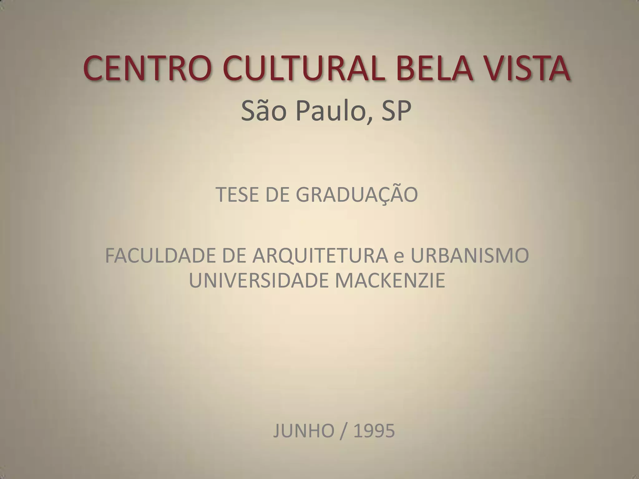 O documento apresenta os projetos arquitetônicos para o Centro Cultural Bela Vistas em São Paulo, incluindo plantas baixas de quatro níveis do edifício com diferentes espaços culturais e comerciais, além de cortes e elevações ilustrando detalhes da estrutura e fachadas.