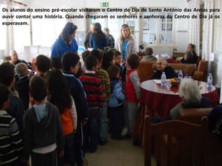 Alunos do ensino pré-escolar visitaram o Centro de Dia de Santo António das Areias para ouvir uma história sobre respeito pelos idosos. Eles elaboraram um cartaz com suas opiniões sobre idosos e conversaram com os utentes do centro.