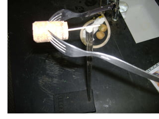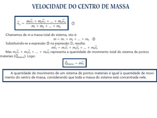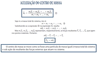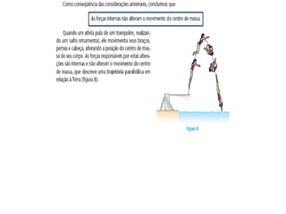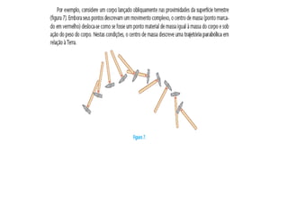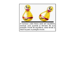 O documento discute o centro de massa, explicando que é a posição média da massa de um corpo ou sistema. Também fala sobre a Torre de Pisa, construída sobre solo instável, e como a remoção de terra da parte norte diminuiu sua inclinação. Por fim, explica que um objeto tem equilíbrio quando a projeção de seu centro de massa intercepta a base de apoio.