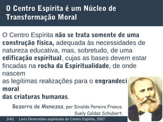 O documento discute o papel do Centro Espírita como um núcleo de transformação moral e espiritual, enfatizando a interação entre encarnados e espíritos desencarnados. Ele aborda as crenças espíritas, o trabalho mediúnico e a necessidade de evolução moral e espiritual dos indivíduos. Além disso, destaca a mediunidade como a alma das tarefas espirituais, funcionando como um hospital e escola para espíritos e encarnados.