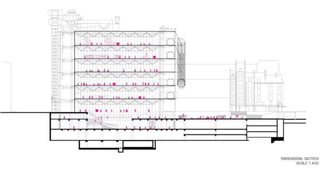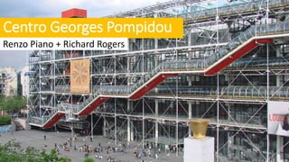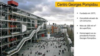 O documento descreve o Centro Georges Pompidou, projetado por Renzo Piano e Richard Rogers em Paris. O centro cultural possui mais de 100 mil m2 e abriga museu, biblioteca, escola de música e centro de desenho. Sua arquitetura high-tech expõe os sistemas técnicos e possui estrutura em aço com cores vivas.