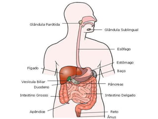 O documento descreve as principais funções e componentes do sistema digestivo humano. Ele explica como a digestão ocorre em cada parte do trato gastrointestinal, desde a boca até o intestino grosso, com a ajuda de estruturas anexas como o fígado e o pâncreas. As funções incluem a mastigação, deglutição, digestão química e absorção de nutrientes para o corpo.