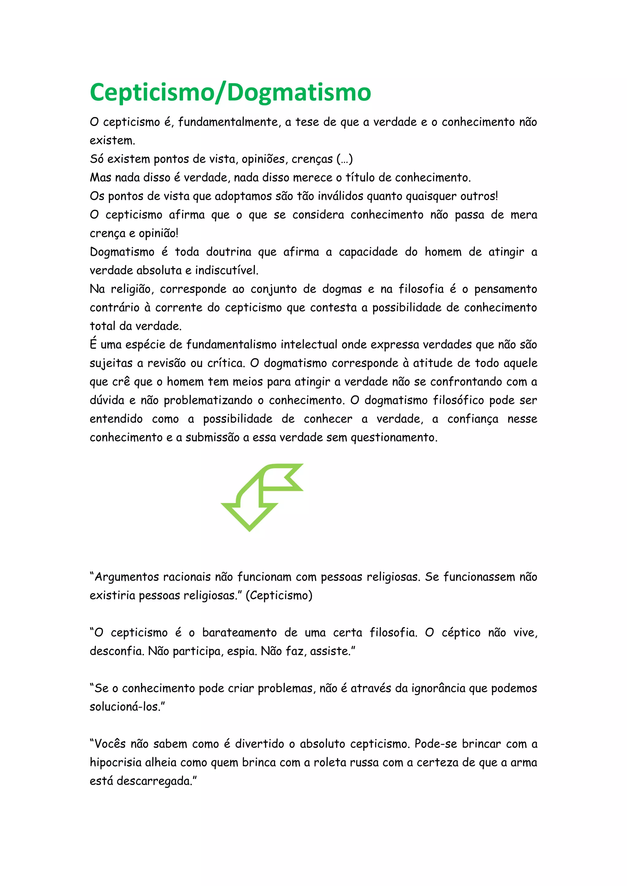 O documento discute os conceitos de ceticismo e dogmatismo. O ceticismo afirma que a verdade e o conhecimento não existem, apenas opiniões e crenças, enquanto o dogmatismo defende a capacidade humana de alcançar a verdade absoluta através do conhecimento total. O dogmatismo corresponde a uma atitude de não questionar as verdades estabelecidas.