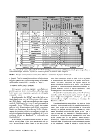 O documento descreve três principais indústrias cerâmicas no Brasil - cerâmica vermelha, branca e de revestimento - e as matérias-primas usadas em cada uma. A cerâmica vermelha usa principalmente argila comum e produz tijolos, telhas e outros produtos. A cerâmica branca usa argilas, caulim, quartzo e fundentes para produzir porcelana, grês e faiança. A cerâmica de revestimento usa argilas e fundentes para revestir pisos e pare
