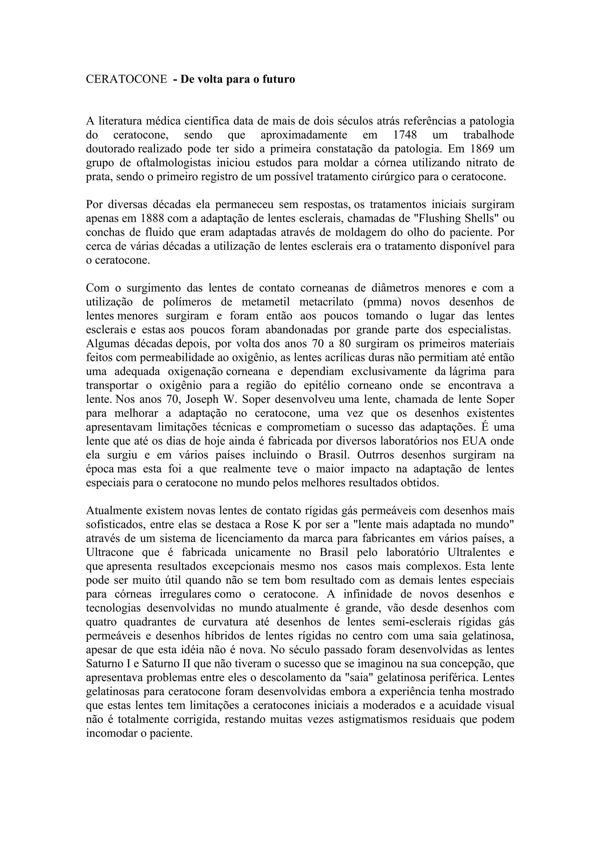 O documento descreve a evolução do tratamento do ceratocone ao longo dos séculos, desde os primeiros registros da patologia até as técnicas modernas como implante de anéis intraestromais, crosslinking e combinações de procedimentos. Também discute possíveis fatores de risco como coçar os olhos com frequência e estresse emocional, e a importância de mais pesquisas para prevenção e tratamento precoce.