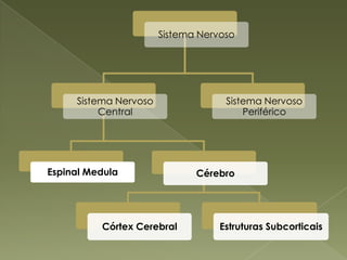 O documento descreve as principais partes e funções do cérebro humano. O cérebro é dividido em córtex cerebral e estruturas subcorticais, sendo o córtex responsável pelas funções mentais superiores. O cérebro é altamente complexo e as suas diferentes áreas trabalham juntas e supre funções umas das outras para processar informações e controlar o corpo.