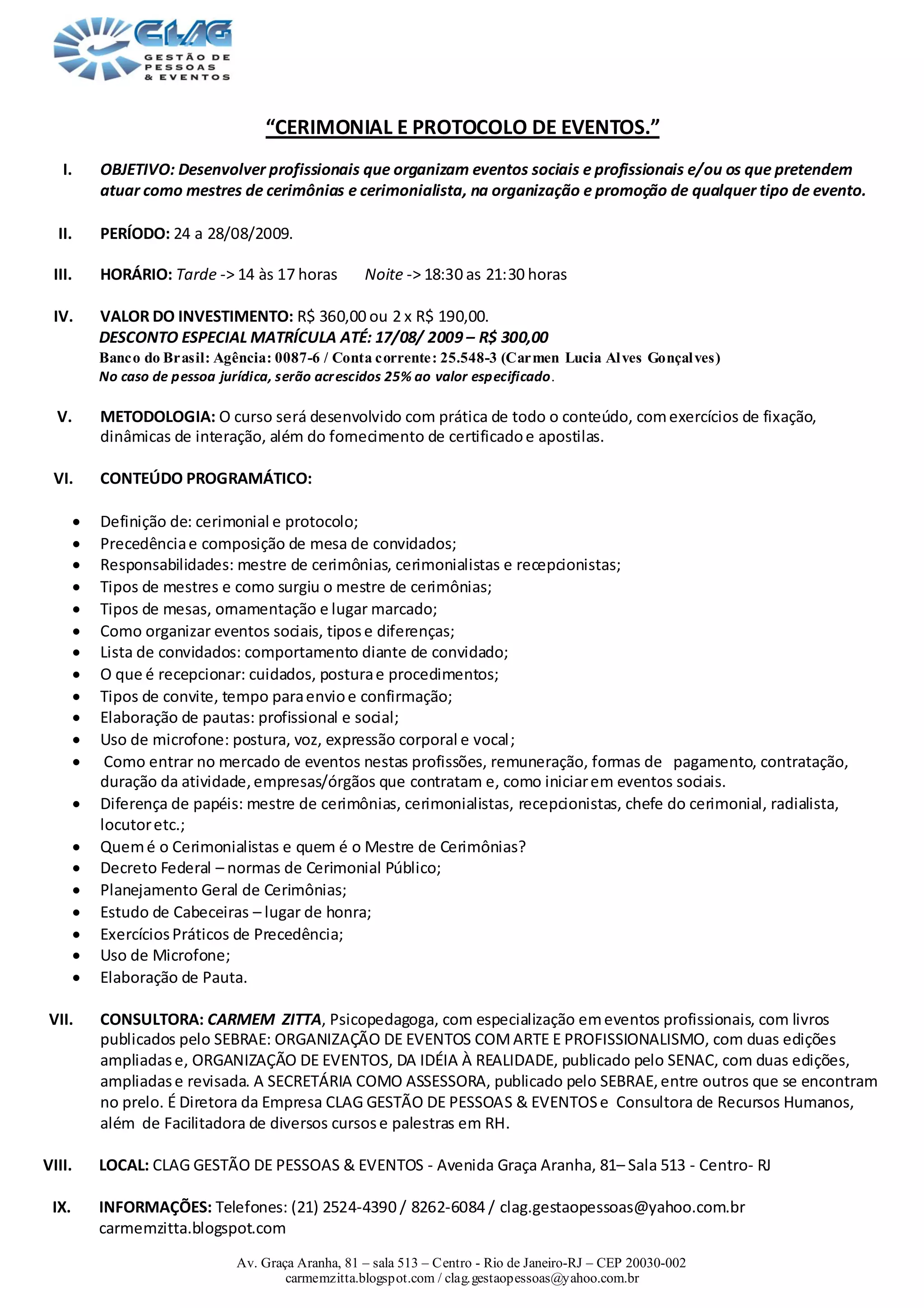 O documento descreve um curso sobre cerimonial e protocolo de eventos a ser realizado entre 24 e 28 de agosto de 2009 no Rio de Janeiro. O curso terá aulas tardes e noites com conteúdo sobre organização de eventos sociais e profissionais. A consultora Carmen Zitta ministrará o curso valorizado em R$ 360,00.