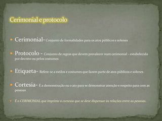 O documento discute os conceitos de cerimonial, protocolo e etiqueta, e fornece diretrizes sobre quando e como aplicá-los em eventos formais. Ele também explica as regras de precedência em Portugal e detalhes importantes sobre a organização de mesas diretoras.