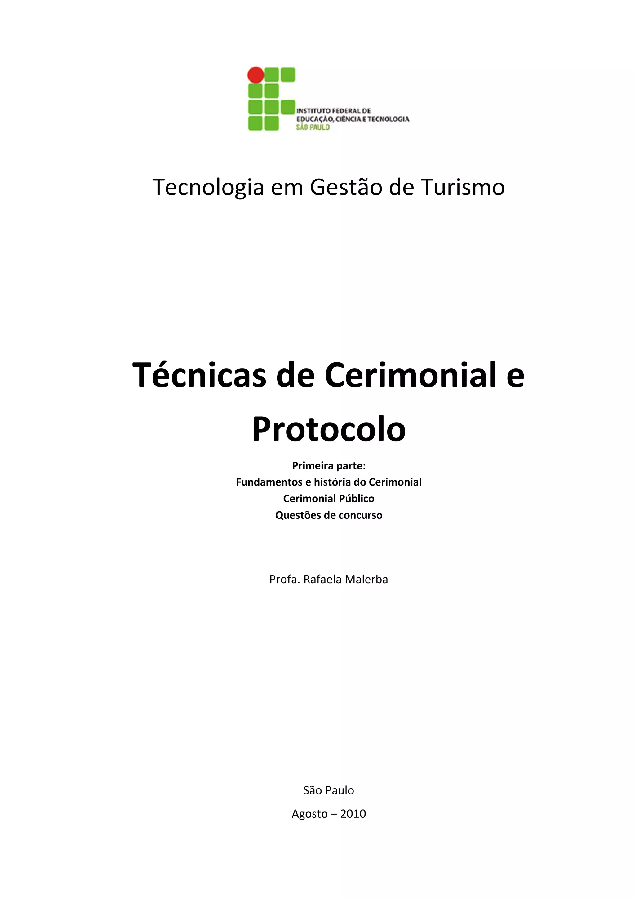 O documento apresenta um resumo sobre técnicas de cerimonial e protocolo. Aborda conceitos básicos como cerimonial, protocolo e etiqueta, além de resgatar a história do cerimonial e descrever as atuações de profissionais como chefe de cerimonial, mestre de cerimônias e diretor de protocolo. Também discute normas de cerimonial público como precedências e organização de mesas, além de símbolos nacionais. Por fim, apresenta exemplos de roteiros para abertura de eventos.