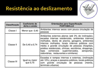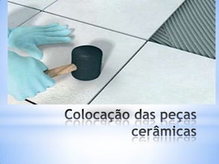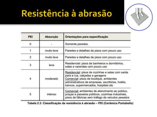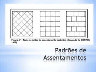 O documento discute as propriedades e tipos de cerâmicas usadas como revestimentos em construção. Ele explica que a cerâmica é um material inorgânico não metálico produzido por tratamento térmico a altas temperaturas e lista diferentes tipos como esmaltada, gres e ladrilho cerâmico. Também descreve propriedades como resistência a gelo, umidade, riscos e ataques químicos. Por fim, fornece referências sobre técnicas construtivas de edificações usando revestimentos cerâmicos