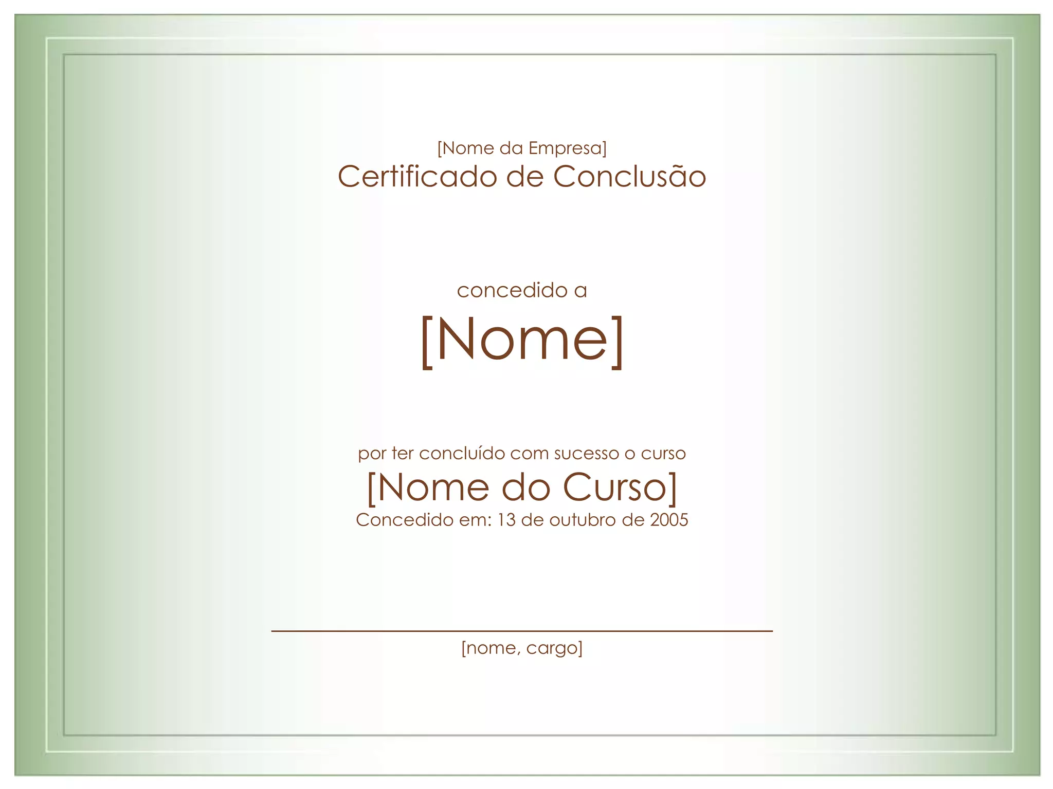 Este certificado reconhece que [Nome] concluiu com sucesso o curso [Nome do Curso] em 13 de outubro de 2005, concedido pela [Nome da Empresa]. O certificado foi assinado por [nome, cargo] em reconhecimento à conclusão do curso.