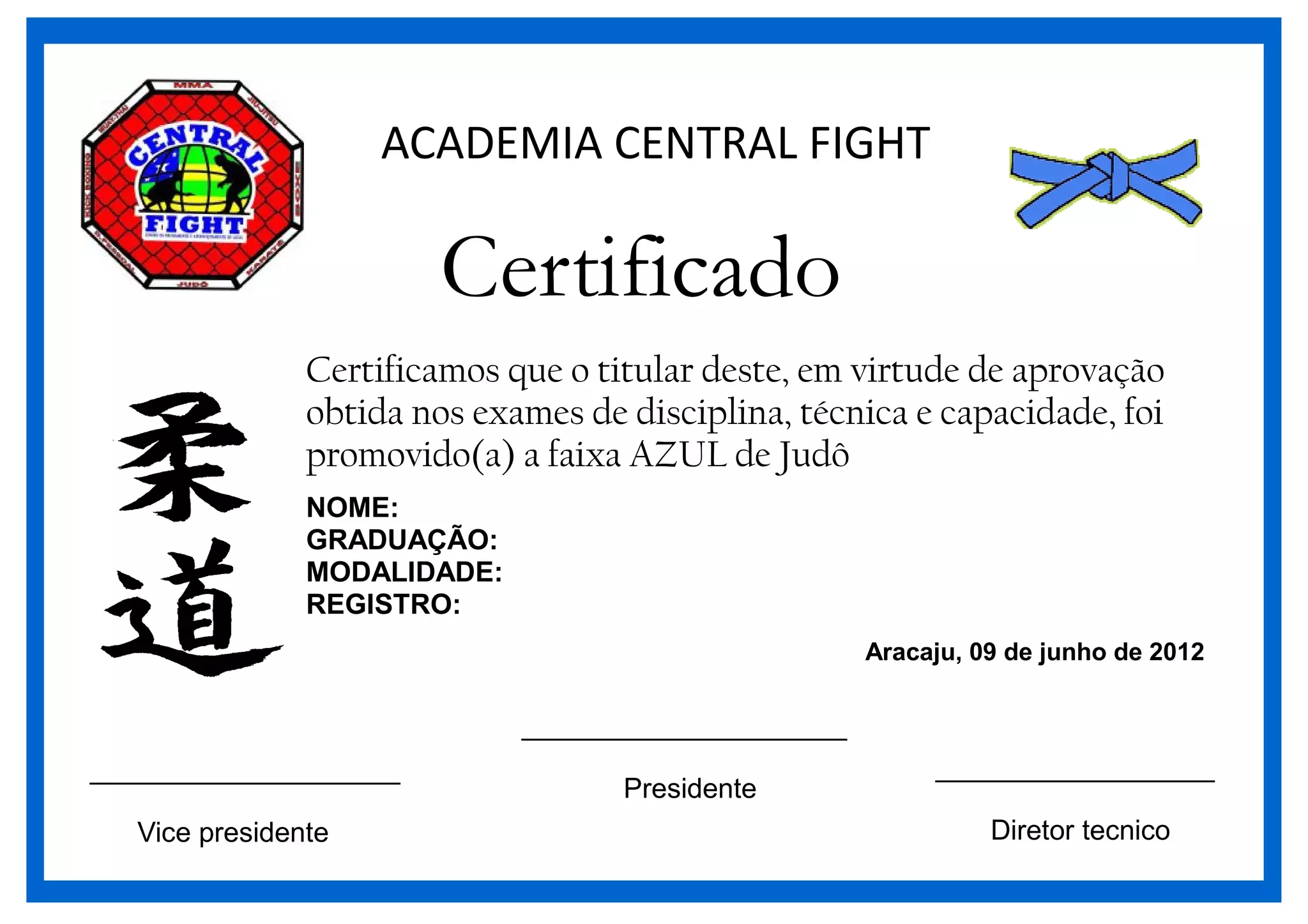 Este certificado promove um aluno à faixa azul de judô após aprovação em exames de disciplina, técnica e capacidade realizados na Academia Central Fight em 09 de junho de 2012.