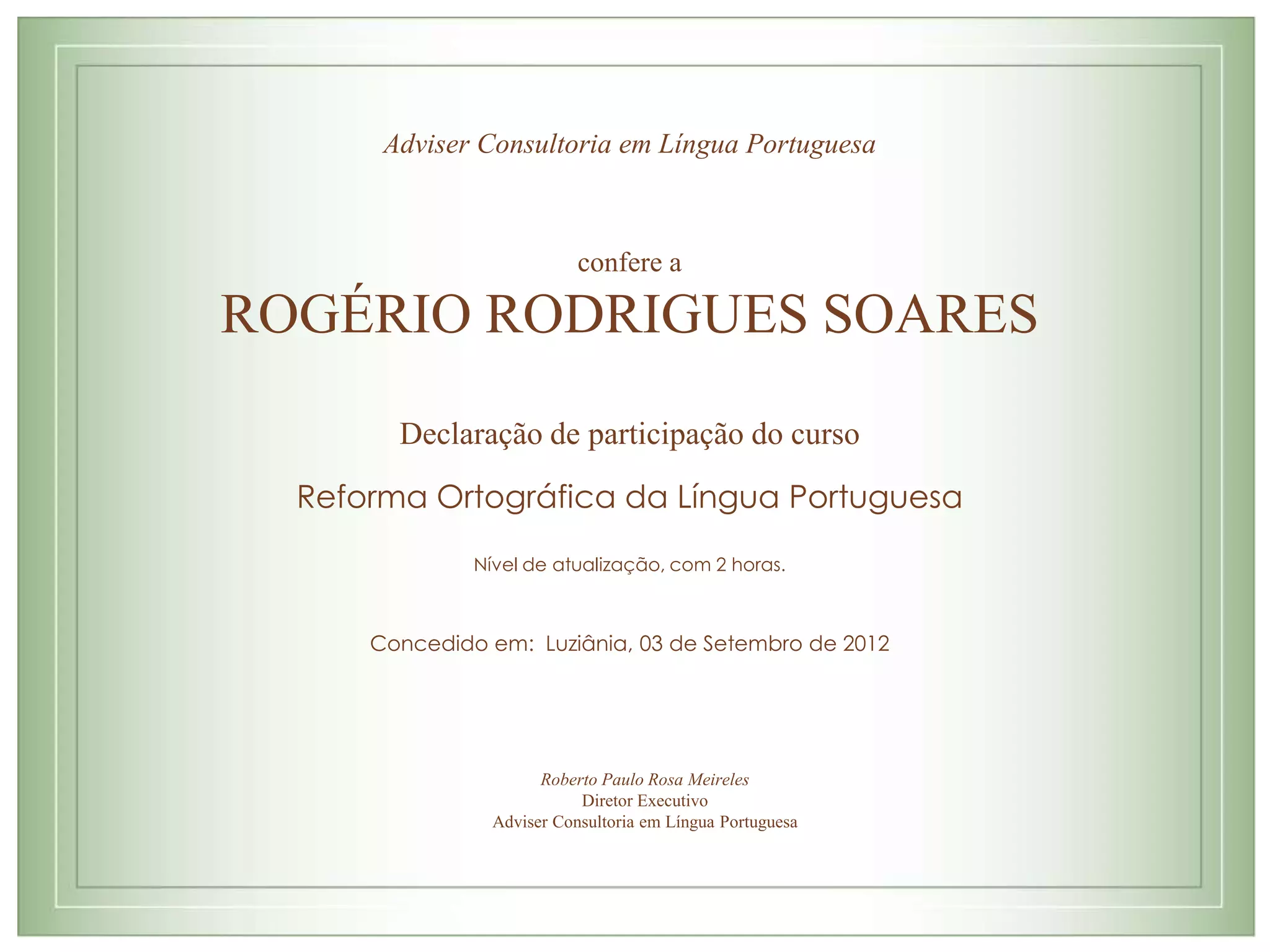 Adviser Consultoria em Língua Portuguesa emitiu uma declaração para Rogério Rodrigues Soares confirmando sua participação em um curso de 2 horas sobre a Reforma Ortográfica da Língua Portuguesa em 3 de setembro de 2012 em Luziânia, assinado pelo diretor executivo Roberto Paulo Rosa Meireles.