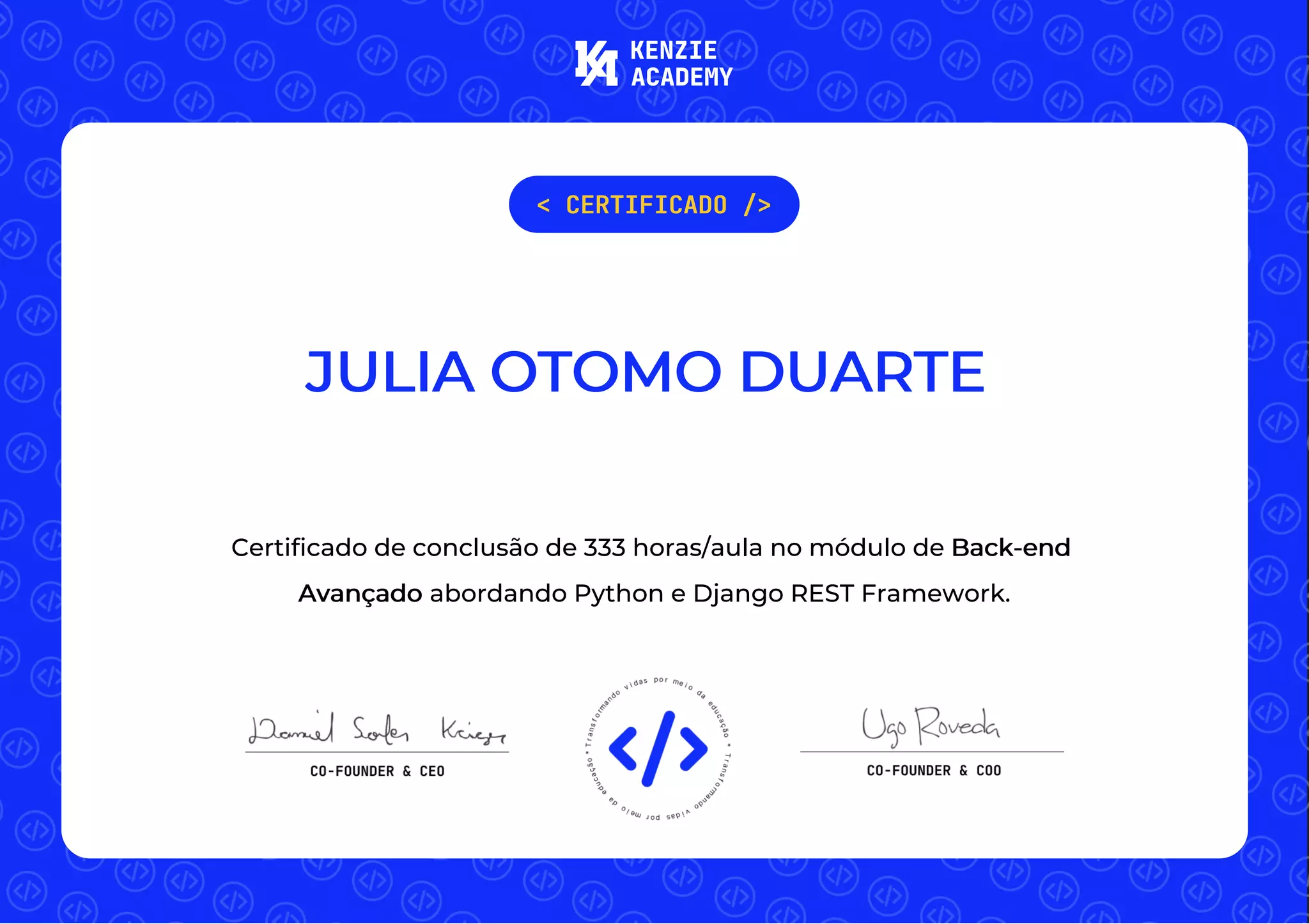 Este certificado atesta que Julia Otomo Duarte concluiu 333 horas de um módulo avançado de back-end abordando Python e o framework Django REST.