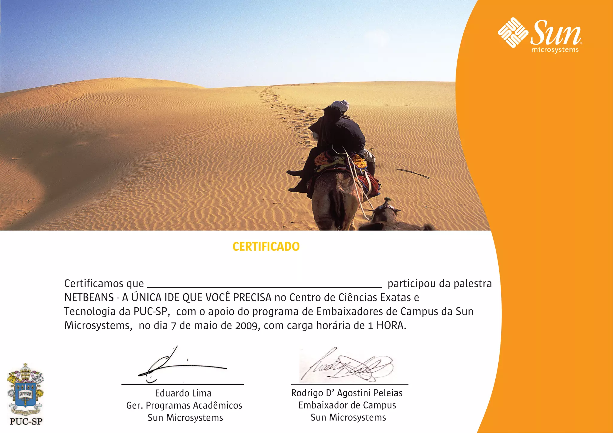 O documento é um certificado atestando a participação de uma pessoa em uma palestra de 1 hora sobre a IDE NetBeans no Centro de Ciências Exatas e Tecnologia da PUC-SP em 7 de maio de 2009, apoiada pelo programa Embaixadores de Campus da Sun Microsystems. O certificado é assinado pelo Gerente de Programas Acadêmicos e pelo Embaixador de Campus da Sun Microsystems.