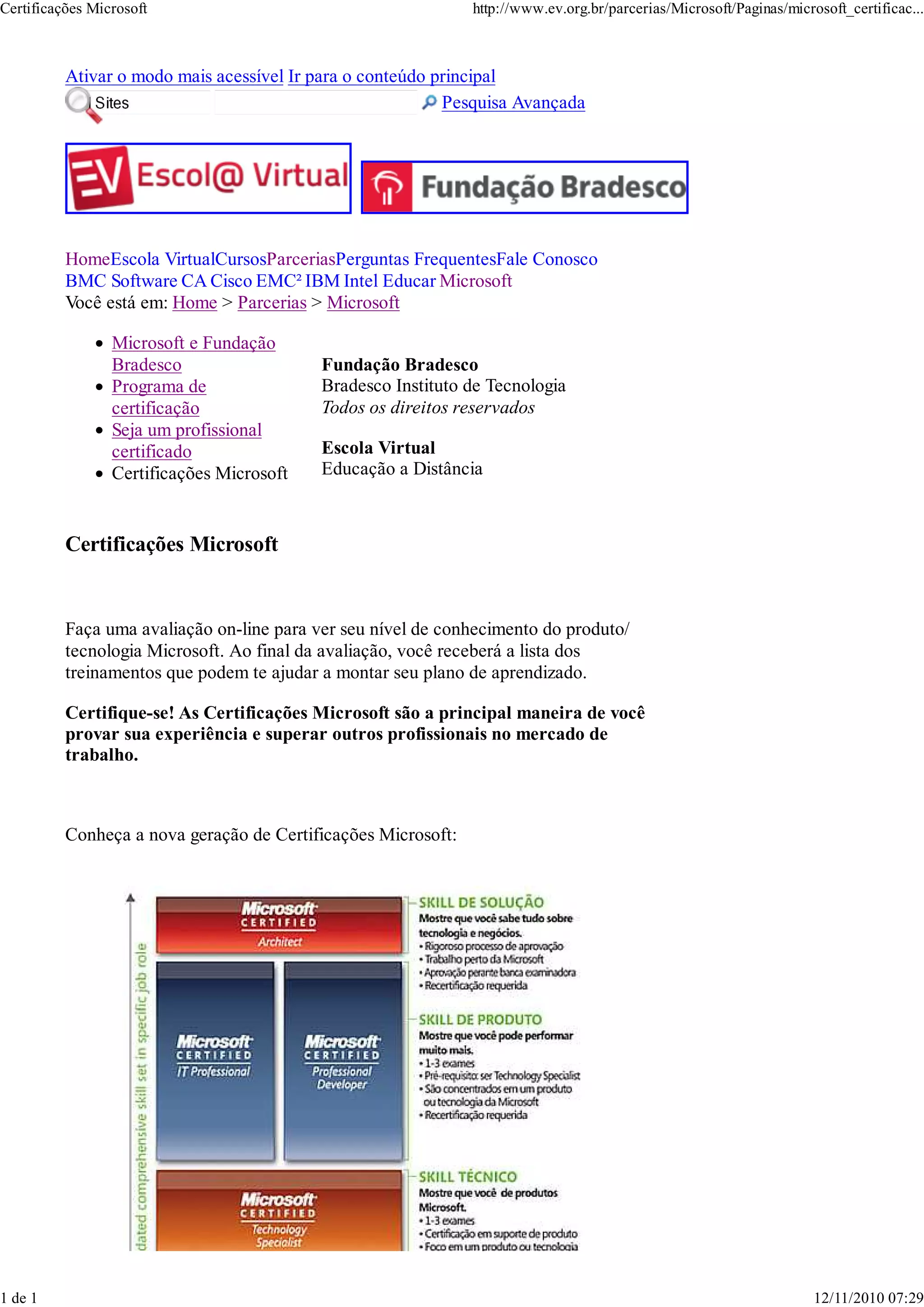 O documento descreve as certificações Microsoft e como elas podem ajudar profissionais a provarem sua experiência e se destacarem no mercado de trabalho. Ele também menciona que os leitores podem fazer uma avaliação on-line para verem seu nível de conhecimento dos produtos e tecnologias da Microsoft e receberem recomendações de treinamentos.