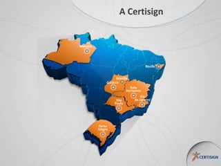 O documento descreve os serviços e soluções de certificação digital da empresa Certisign, incluindo sua presença nacional e internacional, produtos, aplicações, benefícios e como sua plataforma de portal cidadão-governo pode desmaterializar processos de órgãos públicos de forma segura e válida juridicamente.