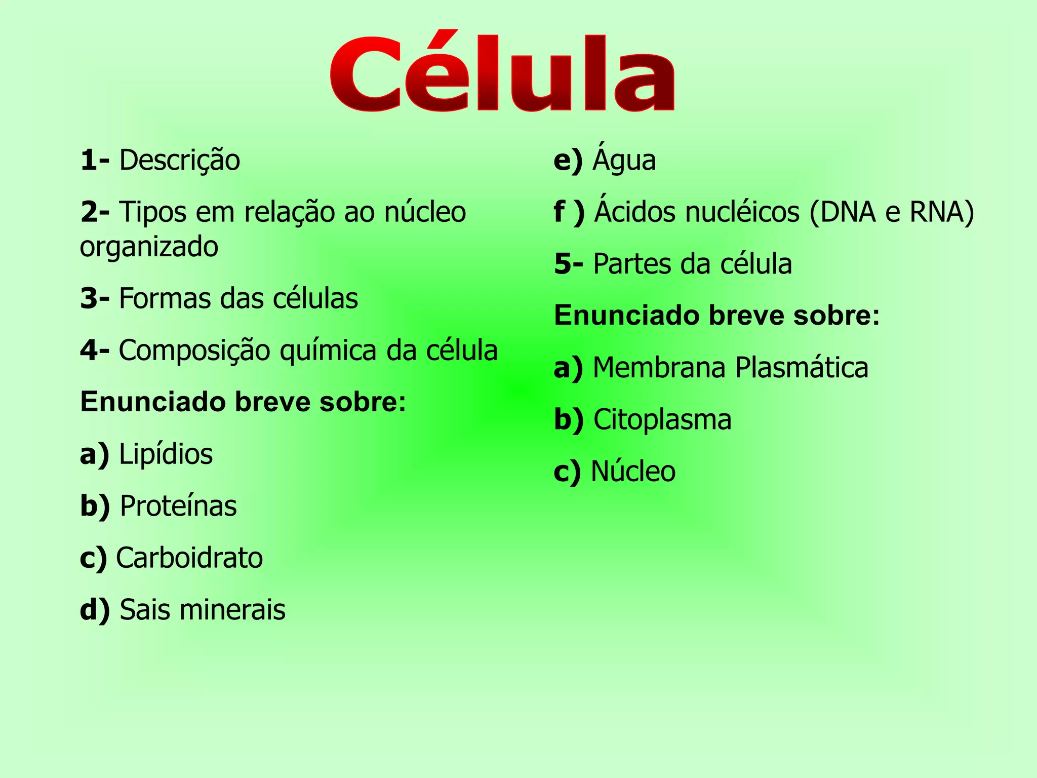 O documento descreve as características básicas da célula, incluindo sua composição química, estruturas e tipos. Ele discute os principais componentes celulares como lipídios, proteínas, carboidratos, sais minerais, água e ácidos nucleicos. Também descreve as principais partes da célula como a membrana plasmática, citoplasma e núcleo.
