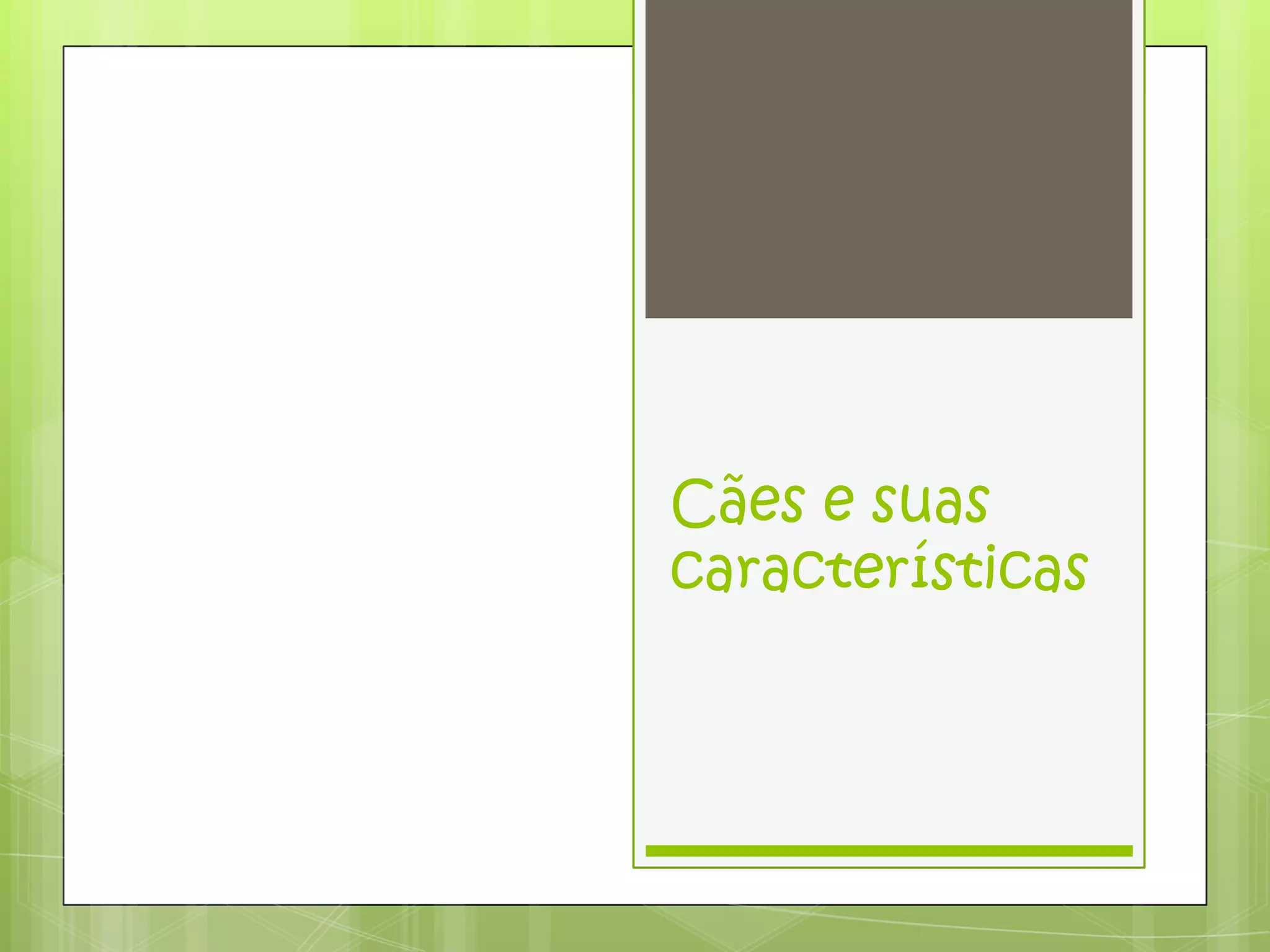 O documento discute as características dos cães, incluindo suas anatomias externas e dentes variados, sua longa história como animais de caça e companhia, e sua reprodução rápida.