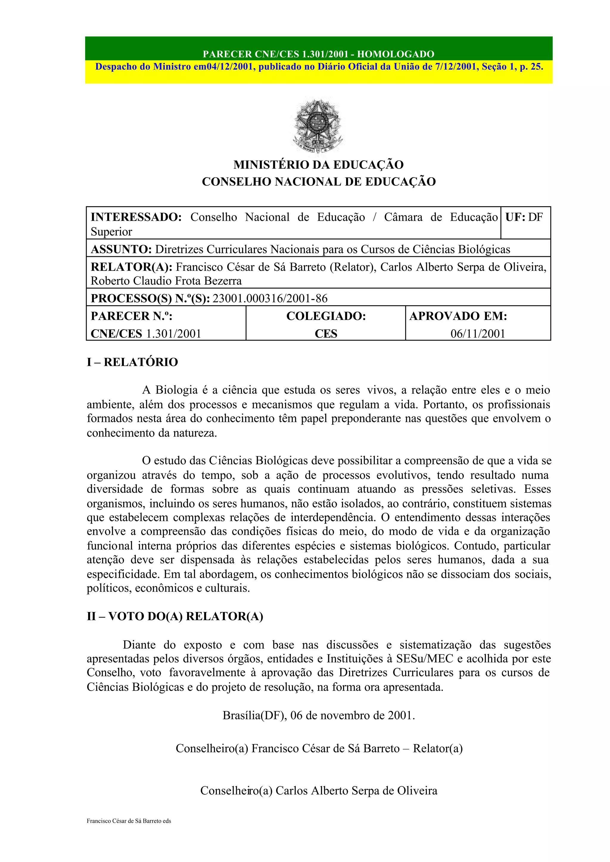 Este documento estabelece diretrizes curriculares para os cursos de Ciências Biológicas no Brasil. O Conselho Nacional de Educação aprovou o relatório do relator, que define o perfil desejado para os graduados, competências, estrutura do curso e conteúdos básicos e específicos. O documento também inclui um projeto de resolução para orientar a formulação dos projetos pedagógicos dos cursos de acordo com estas diretrizes.