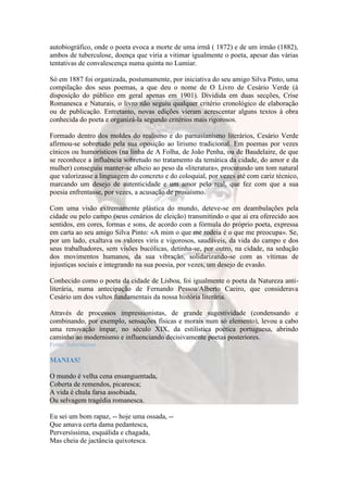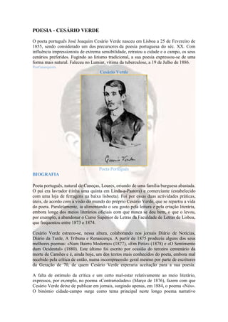 O documento fornece informações biográficas e estilísticas sobre o poeta português Cesário Verde. Em três frases: