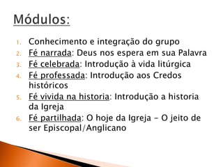 1) O documento apresenta um programa de iniciação em anglicanismo dividido em 6 módulos que abordam diferentes aspectos da fé.