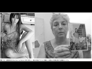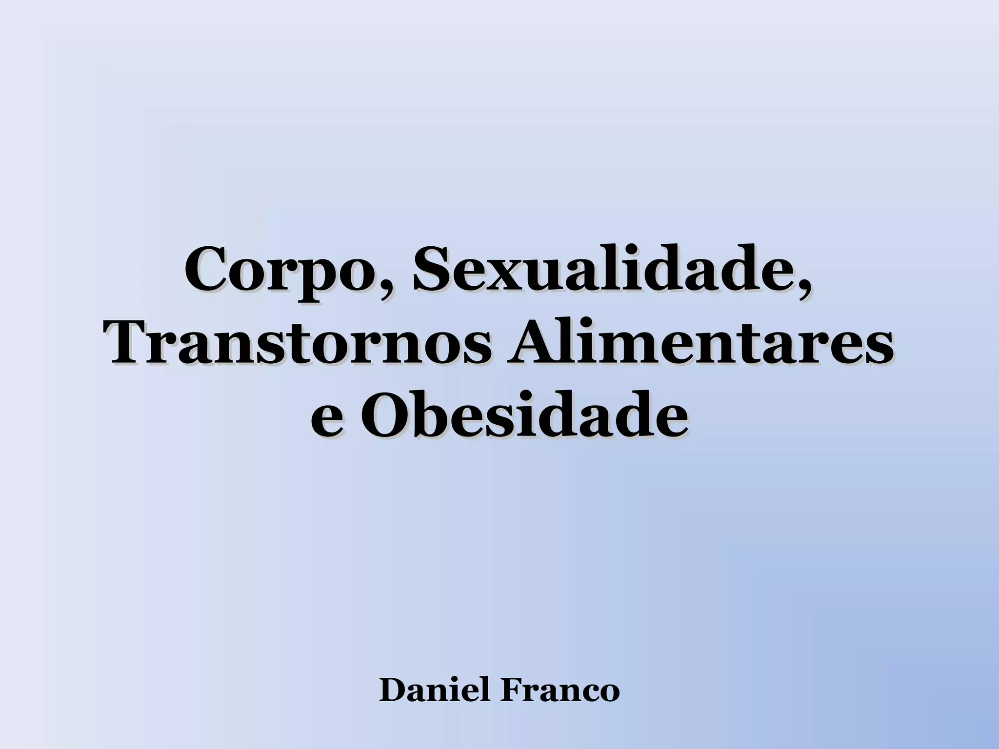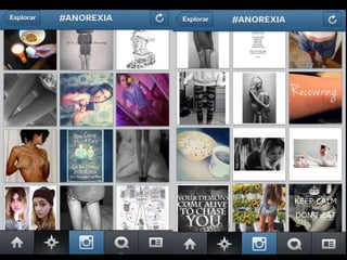 O documento discute transtornos alimentares e obesidade, referências culturais como a imagem do corpo e fatores de risco, sites pró-ANA e pró-MIA, e moda inclusiva. Também fornece sugestões de leitura sobre o tema.