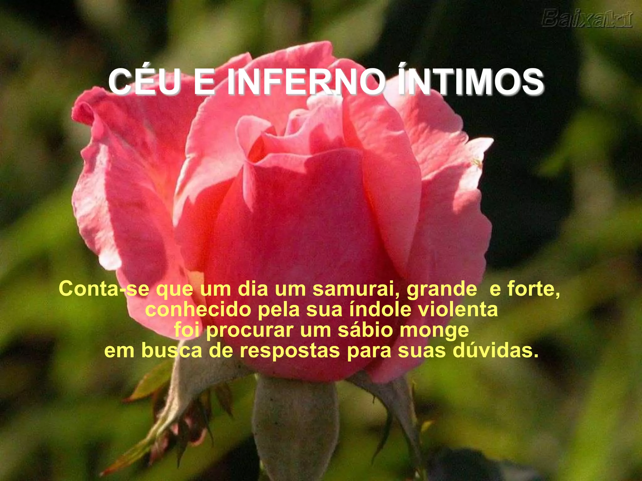 1) O monge ensina uma lição ao samurai sobre o céu e o inferno ao ofendê-lo propositalmente e quase ser morto por ele. 2) O samurai percebe que quase cometeu um ato terrível sob raiva e pede perdão ao monge. 3) O monge diz que o perdão marca o começo do céu, mostrando que podemos escolher entre construir céu ou inferno em nossa intimidade diariamente.