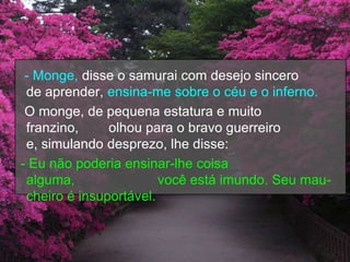 O monge ensina uma lição ao samurai sobre o céu e o inferno ao provocá-lo intencionalmente até quase ser morto. Ele explica que tanto o céu quanto o inferno existem dentro de nós mesmos e dependem das decisões que tomamos diante das situações da vida. No final, cabe a cada um preservar a própria intimidade e iluminá-la com a luz da sabedoria.