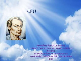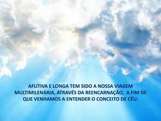 O documento discute a evolução do conceito de céu ao longo da história humana. Começa com visões do céu em culturas antigas como a chinesa, indiana, egípcia e grega, e menciona outras como a gaulesa e romana. Explica que hoje entendemos que o céu é um estado espiritual que varia para cada um de acordo com sua visão interior, e não um lugar físico com limites.