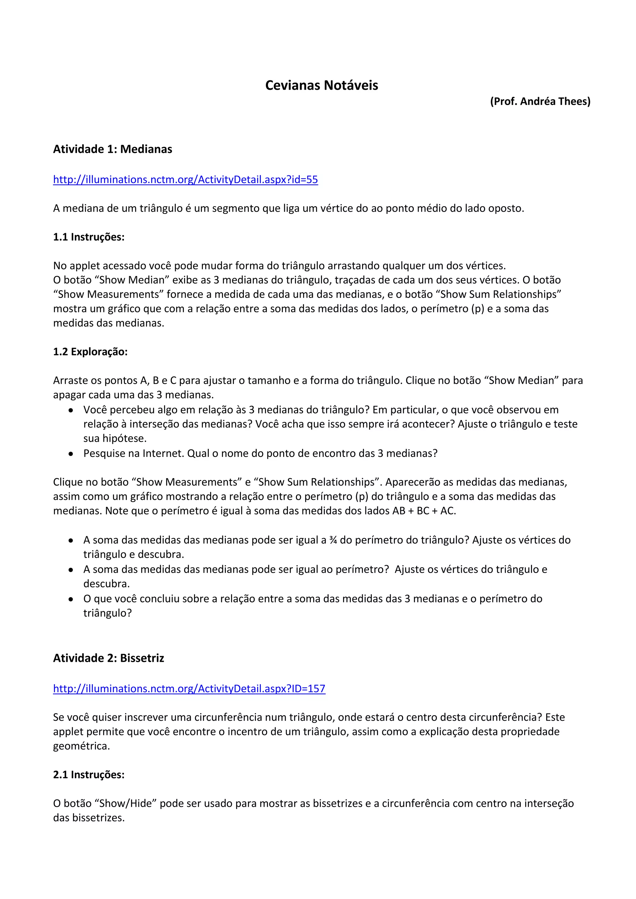 O documento apresenta três atividades interativas sobre propriedades geométricas de triângulos, como medianas, bissetrizes e a reta de Euler. Na primeira atividade, os usuários exploram as medianas e observam que elas se interceptam no baricentro. Na segunda, constroem a circunferência inscrita e encontram o incentro. Na terceira, localizam o ponto equidistante de três cidades. Uma atividade extra apresenta a construção da reta de Euler.