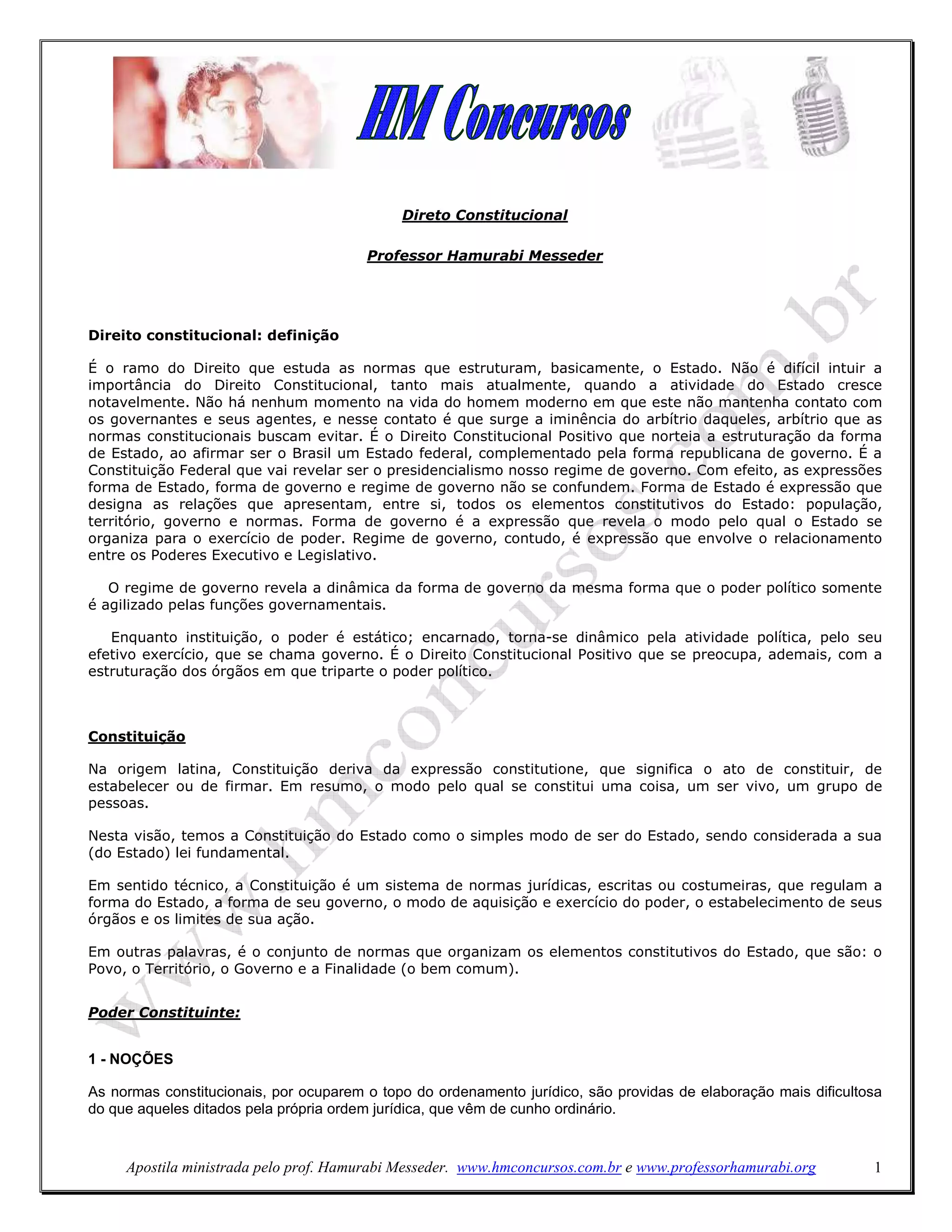 O documento discute a supremacia da Constituição e o controle de constitucionalidade. A Constituição é a lei fundamental que organiza o Estado e estabelece direitos, deveres e garantias. Ela está no topo da hierarquia jurídica e todas as leis e atos normativos devem estar de acordo com seus princípios. O controle de constitucionalidade garante que todas as normas respeitem a Constituição.