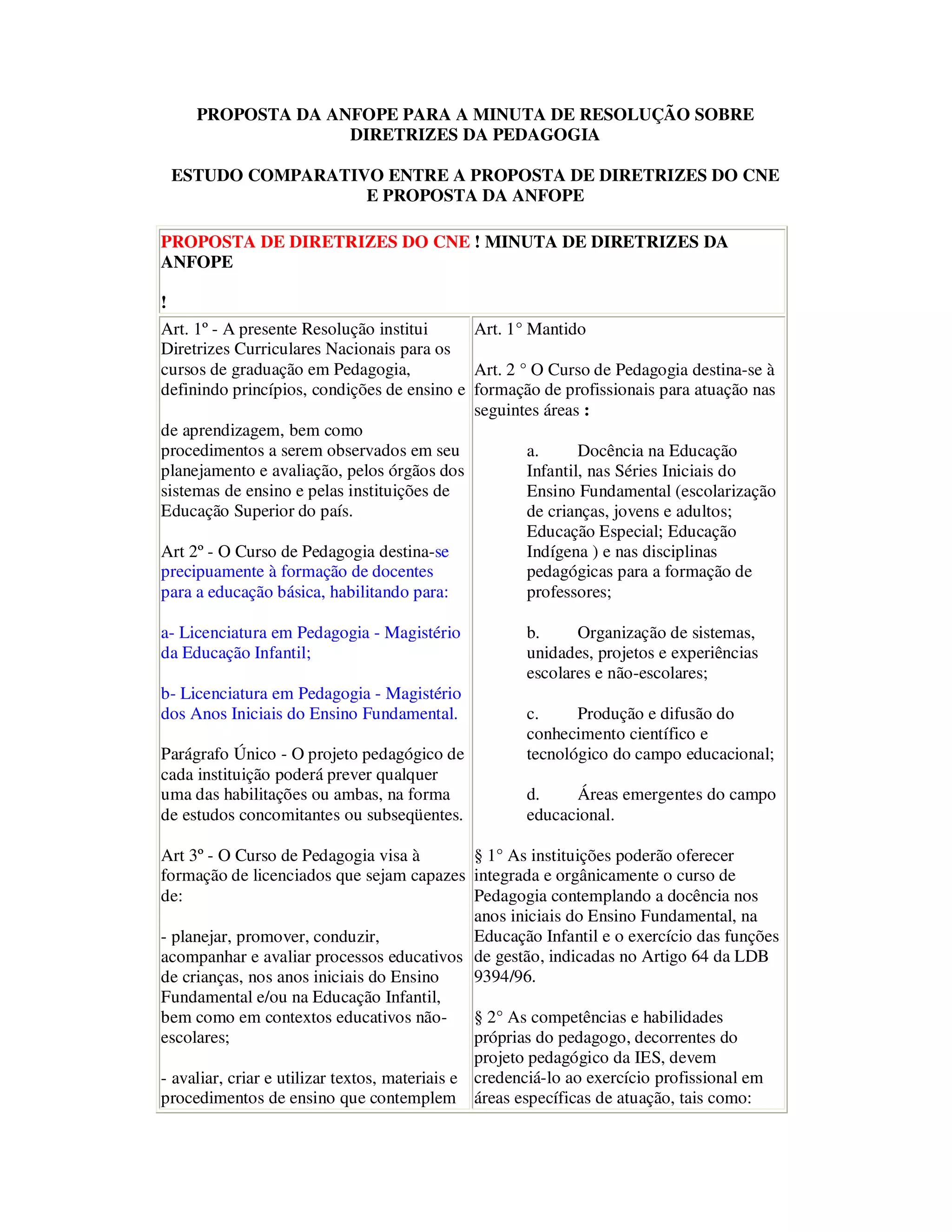 Este documento compara as propostas do Conselho Nacional de Educação (CNE) e da Associação Nacional dos Programas de Pós-Graduação em Educação (ANFOPE) para diretrizes curriculares nacionais do curso de Pedagogia. Ambas as propostas definem os objetivos e estrutura do curso, com foco na formação de professores para a educação básica. A proposta da ANFOPE enfatiza ainda a formação para atuação em áreas emergentes e a integração entre teoria e prática.
