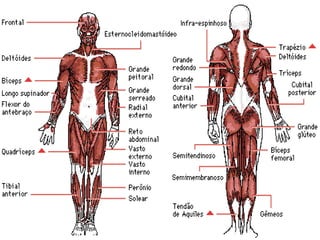 O documento discute três tipos de tecido muscular: liso, esquelético e cardíaco. O músculo liso controla órgãos internos e vasos sanguíneos. O músculo esquelético permite movimentos voluntários dos ossos. O músculo cardíaco forma o coração. O texto também aborda distrofias musculares e como músculos trabalham em pares para movimentar ossos.