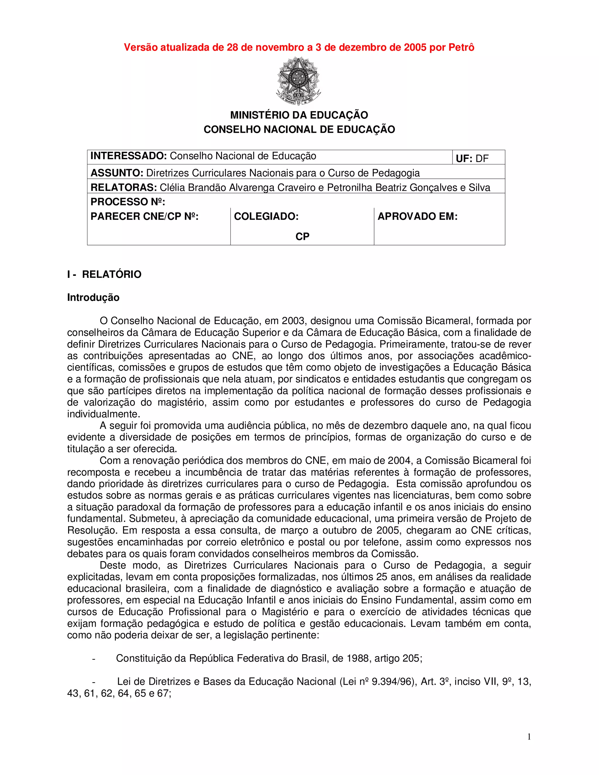1) O documento apresenta as Diretrizes Curriculares Nacionais para o Curso de Pedagogia no Brasil, definidas pelo Conselho Nacional de Educação.