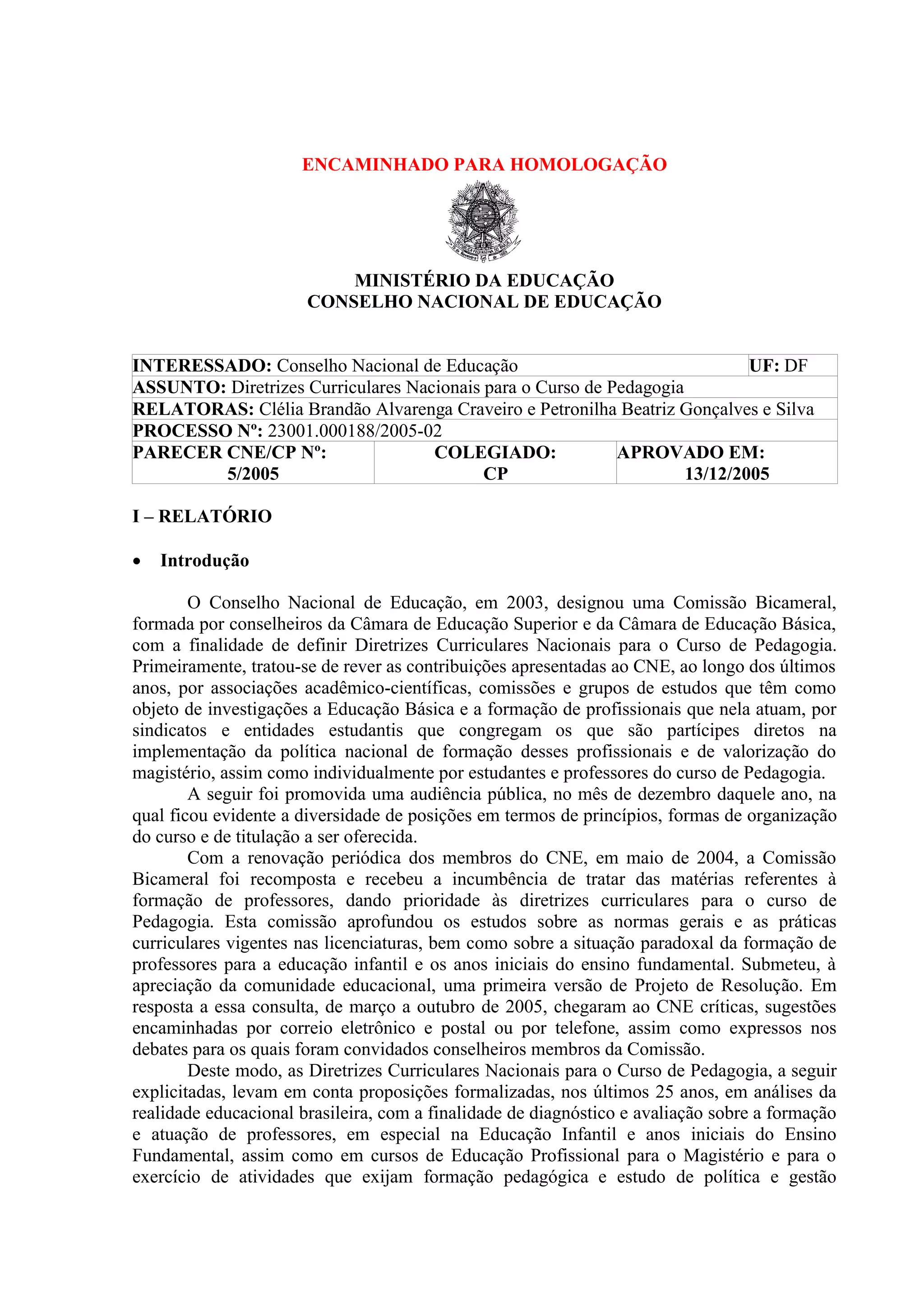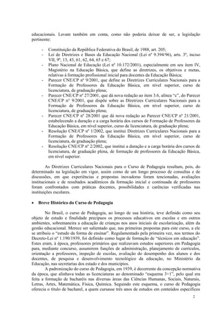 Este documento apresenta diretrizes curriculares nacionais para o curso de pedagogia no Brasil. Resume a evolução histórica do curso de pedagogia no país desde 1939 e discute as mudanças nas finalidades e habilitações oferecidas pelo curso ao longo do tempo. Também descreve o processo de consulta e discussão que levou ao desenvolvimento das novas diretrizes curriculares nacionais para o curso.