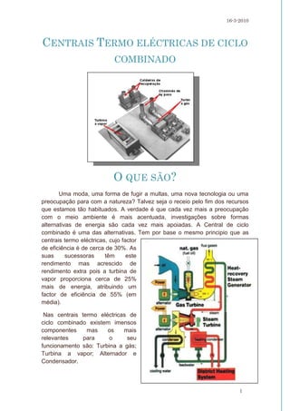 1) O documento descreve centrais termoelétricas de ciclo combinado, incluindo seus principais componentes e como funcionam.