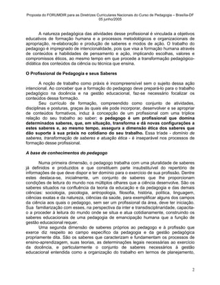 Este documento apresenta a proposta do Fórum de Diretores de Faculdades de Educação (FORUMDIR) para as diretrizes curriculares nacionais do curso de pedagogia. A proposta define o pedagogo como um profissional que domina saberes, transforma saberes em situações reais e atua de forma ética. O currículo do curso de pedagogia deve preparar os estudantes nestas três áreas por meio da construção do conhecimento, formação integrada e articulação entre teoria e prática.